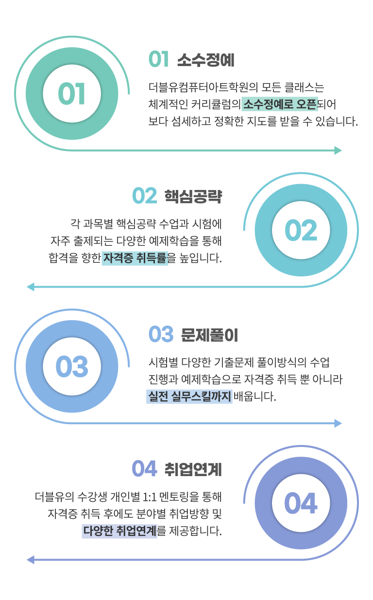 • 소수정예로 진행되는 더블유컴퓨터아트학원의 수업을 통해 수강생은 구체적이고 섬세한 지도를 받을 수 있습니다. 강사 또한 개개인을 위한 수업지도에 집중할 수 있도록 커리큘럼이 구성되어 있어 더블유컴퓨터아트학원은 매 회 90% 이상의 자격증 취득률을 유지하고 있습니다.